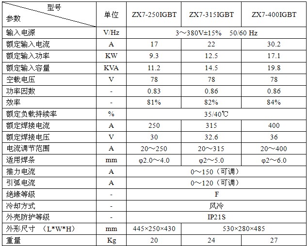 6.推力电流和引弧电流无级可调,适合于各种酸碱性焊条的施焊;