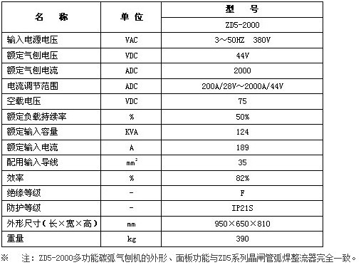 ZD5-2000多功能碳弧气刨机是一种具有多种特性的多功能电源,除了用于碳弧气刨外、还可以用作电渣焊电源、埋弧自动焊电源、带极堆焊电源。ZD5-2000多功能碳弧气刨机电源主电路采用双反星形带平衡电抗器的晶闸管整流电路,此电路过载能力强、调节精度高、动特性好、可靠性极高,本产品能对电网电压波动进行迅速的自动补偿,保证气刨电流不受电网电压波动的影响。